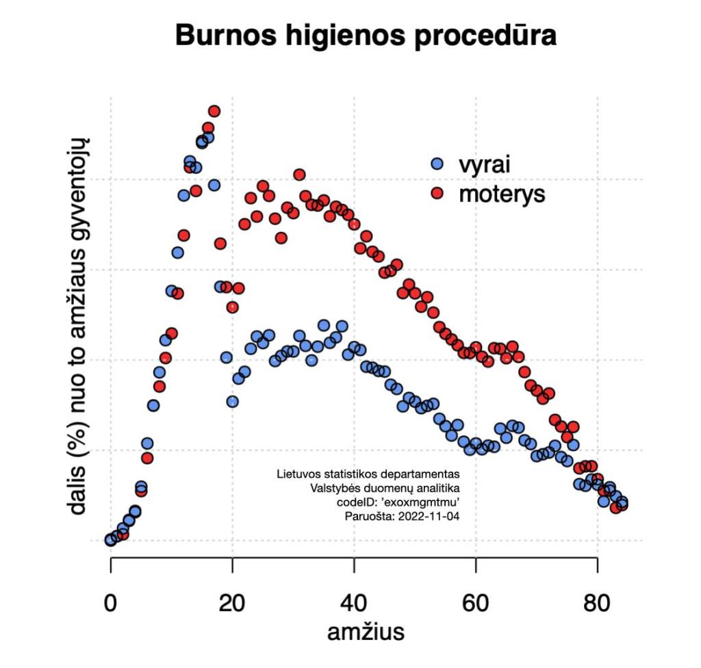Greičiausiai ne visos sveikatos priežiūros įstaigos teikė šią informaciją atlikdamos burnos higienos procedūrą tiriamuoju laikotarpiu. Tai matome iš tokio fakto: iki 2022 m. rugpjūčio apie tokias procedūras pranešė tik 250 įstaigų, po 2022 m. rugpjūčio apie jas pranešė net 675 įstaigos. Į tai atsižvelgsime, iliustracijoje neatvaizduodami konkrečių procentinių verčių, tačiau duomenų nepilnumas neturės įtakos vyrų/moterų santykiui ar skirtumams tarp amžiaus grupių. Šiuose nepilnuose duomenyse iš viso radome 120 tūkst. asmenų, kurie per paskutinius trejus metus turėjo bent vieną burnos higienos procedūrą.