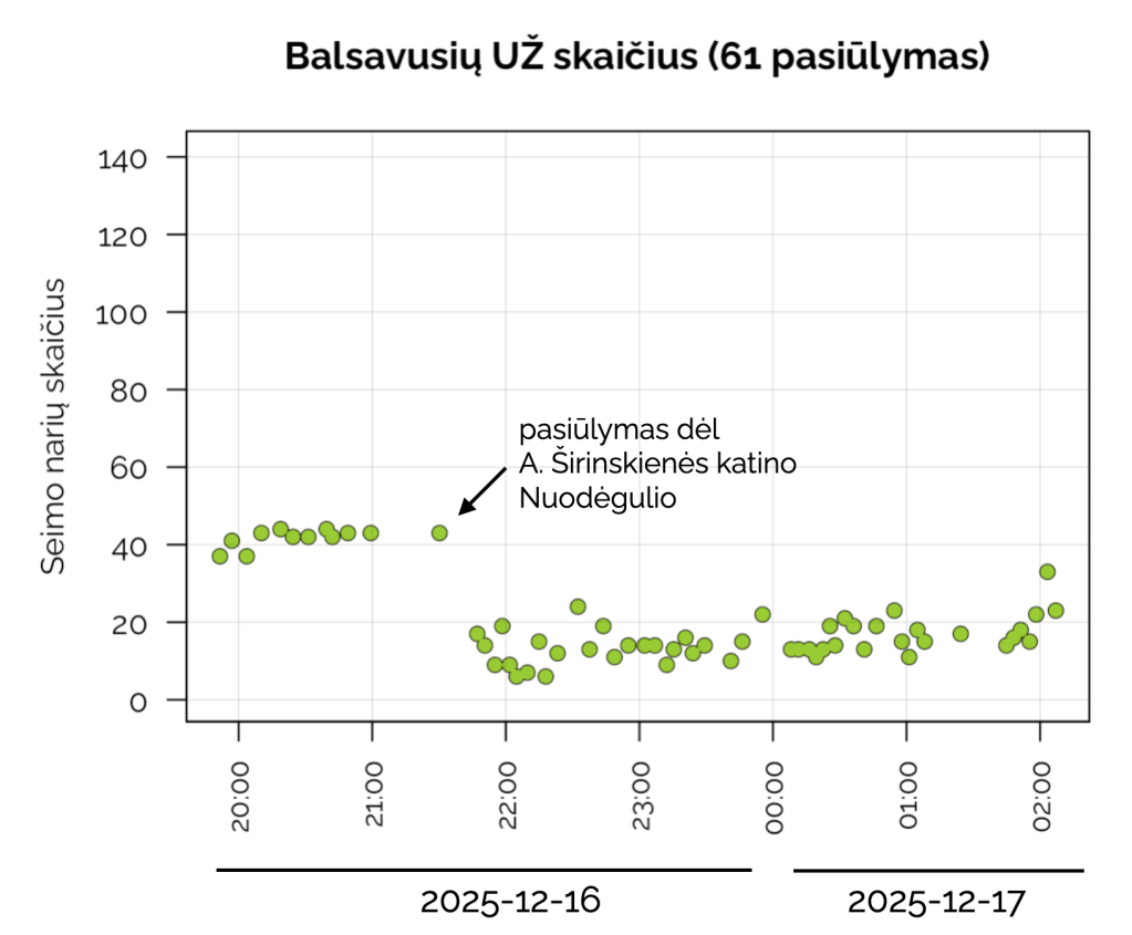 Matome bangavimus, bendrą aktyvumo mažėjimą, ir matome vieną išskirtį – ties 21:30 – kuomet dalyvavusių Seimo narių skaičius nukrito nuo ~100 iki 77.
