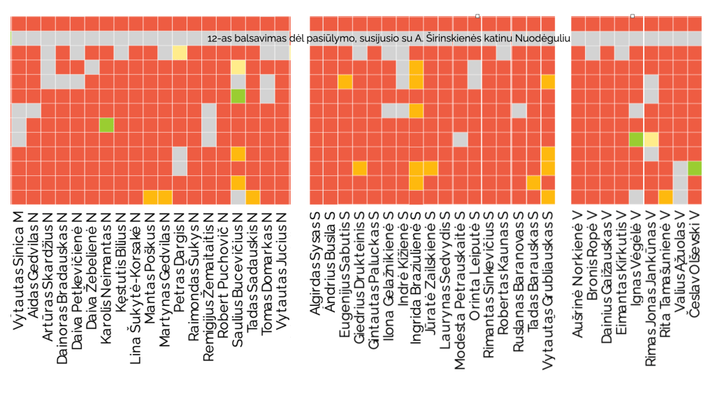 Tas pats 12-asis balsavimas neturi jokio smuktelėjimo žemyn (kaip ir anksčiau, UŽ balsuoja apie 40 parlamentarų). Vadinasi opozicija dirbo kaip dirbusi. Tai valdantieji pamiršo balsuoti PRIEŠ. Jei į Seimo salę po pertraukos valdančiųjų būtų sugrįžta laiku, būtų spėta subalsuoti prieš Širinskienės katiną. Bet Seimo po pertraukos susidarė opozicijos dauguma. Balsavimo duomenų išklotinėje aiškiai matome tuos balsuoti nespėjusius valdančiuosius: